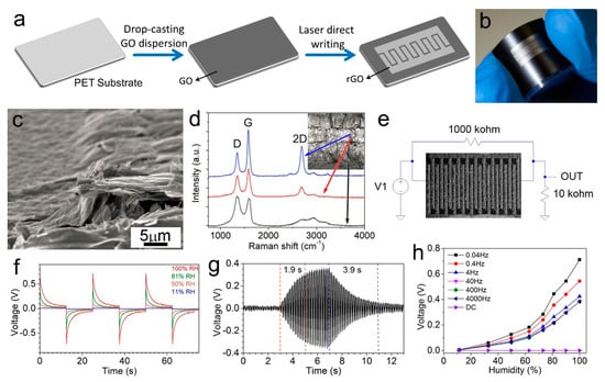 Schematic illustration for the preparation of rGO patterns by laser direct writing (a), interdigitated pattern of rGO/GO/rGO prepared on a flexible poly(ethylene terephthalate) (PET) film (b), SEM image of the structures obtained by laser direct writing (c), Raman spectra at different positions of a laser-irradiated line (d), electronic circuit of the rGO/GO/rGO humidity sensor (e), output waves of the humidity sensor responding to a rectangular alternating current (ac) wave with a (peak) pk−pk voltage of 1 V at 0.04 Hz (f), response and recovery of the humidity sensor at 40 Hz (g), and the change of the sensing peak voltages toward RH at different frequencies (h). Reproduced with permission from [131], Copyright American Chemical Society, 2018.
