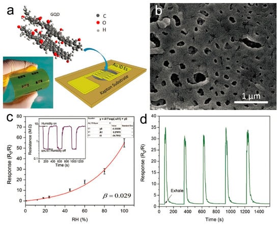 Graphene quantum dots (GQDs) have similar structures and properties as layered graphene in the 2D layer, but their electronic structure is governed by the edge electronic states and size (quantum confinement), which can be manipulated to control their properties. Sreeprasad et al. demonstrated the electron-tunneling modulation in a percolating network of graphene quantum dots selectively assembled on a polyelectrolyte microfiber, which was employed to construct a humidity sensor, where the water-mass transferred from the polymer and electrons transported through the GQDs [153]. The reduction of 0.36 nm in the tunneling barrier width between GQDs increased the conductivity of the device by 43-fold. Ruiz et al. synthesized GQDs through pyrolysis of citric acid drop-casted on a metallic interdigitated microelectrode, forming a resistive humidity sensor [152]. The sensor showed an exponential dependence of sensitivity with the RH in the range of 15–80%, and a fast response time estimated at around 5 s. The capillary condensation of water molecules on the GQD surfaces accounted for the sensing performance. Then, Alizadeh et al. prepared a GQD humidity sensor by using a similar approach [151], which exhibited outstanding sensitivity to the variation of environment humidity with a response time of about 10 s. However, they found there were two different sensing mechanisms existing between 0–52% and 52–97%. In the low RH range, the adsorption of water molecules increased the hole-type carriers, thus decreasing the electrical resistance, while in the high RH range, the improved ionic proton transportation devoted by the adsorbed water molecules induced the resistance decrease of the sensor. Hosseini et al. demonstrated the first flexible humidity sensor based on GQDs, which were prepared using a facile hydrothermal method. The as-prepared GQDs were drop-casted on an interdigitated microelectrode on a flexible polyimide substrate (Figure 13a), and the GQD film showed a porous structure (Figure 13b). The sensor showed an exponential behavior response towards humidity in the RH range of 12–100%, with a response and recovery time of 12 and 43 s, respectively (Figure 13c). The device exhibited a fast response when exposed to a flow of exhaled breath with about 90% RH (Figure 13d) [151]. From the performance summary in Table 3, it can be found that GQDs-based humidity sensors have some advantages, such as high response, high selectivity, and relatively fast response and recovery. More studies should be done to develop high-performance humidity sensors based on GQDs.