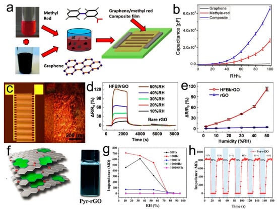 Schematic representation of the graphene/methyl-red composite based humidity sensor (a), and capacitance versus relative humidity (% RH) characteristics curves of the graphene/methyl-red composite, methyl-red only, and graphene only based humidity sensors measured in the humidity chamber at a 1 kHz frequency (b). Reproduced with permission from [161], Copyright, 2016 Elsevier B.V. Optical images of the comb electrode before and after coating a layer of hydrophobin (HFBI) wrapped rGO flakes (c), real-time responses of HFBI wrapped rGO sensor (left) and bare rGO sensor (right) to RH ranging from 2% to 50%, respectively (d), and relative resistance change upon the exposure to water molecules at the maximum equilibrium vs. RH values (e). Reproduced with permission from [162], Copyright Elsevier B.V., 2017. Schematic of the supramolecular assembly of Pyr-rGO sheets with the corresponding physical image in dispersion (f), the impedance curves of Pyr-rGO based humidity sensors measured at different frequencies under different RH levels (g), and the five-cycle response-recovery curve of Pyr-rGO (h). Adapted from [163].
