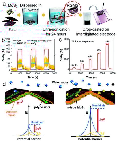 - Park, S.Y.; Lee, J.E.; Kim, Y.H.; Kim, J.J.; Shim, Y.-S.; Kim, S.Y.; Lee, M.H.; Jang, H.W. Room temperature humidity sensors based on rGO/MoS2 hybrid composites synthesized by hydrothermal method. Sens. Actuat. B Chem. 2018, 258, 775–782. [Google Scholar] [CrossRef]