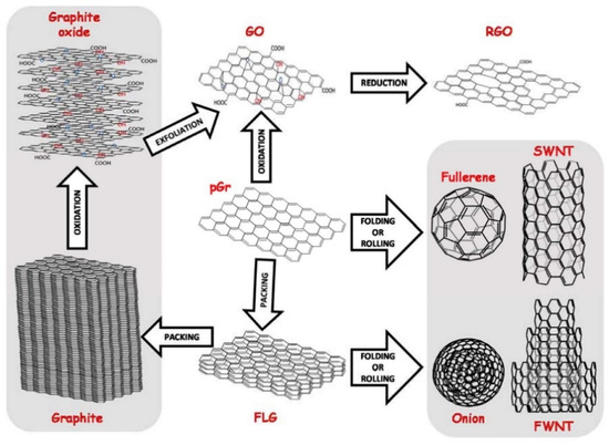 Several materials derived from the two-dimensional structure of graphene. Grey area indicates that these nanoallotropes are not included in graphene-family nanomaterials (GFNs), but constitute separated families. Reproduced with permission from [67]. Copyright Elsevier, 2017.