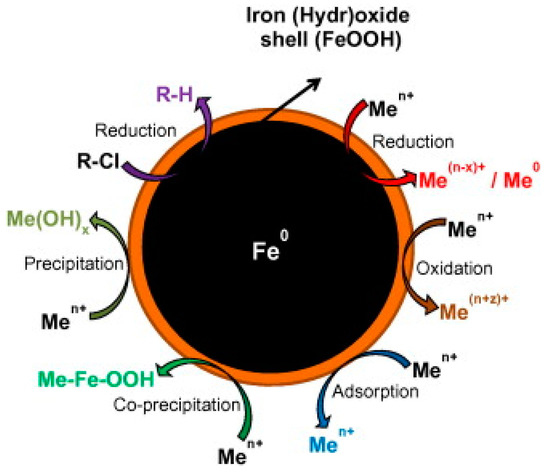 Core-shell structure of nanoscale zero valent iron (nZVI) depicting various mechanisms for the removal of metals and chlorinated compounds. Reproduced with permission from [91]. Copyright Elsevier, 2013.