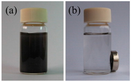 Magnetite (Fe3O4)-based nanomaterials are another kind of widely used nanometer adsorbent due to their low cost, simplicity of use, easy availability, and environmental friendliness [141]. Similar to maghemite, magnetite-based nanomaterials could be easily separated from the aqueous solution after treatment by adding a magnetic field (Figure 6). There have been numerous reports on their applications in heavy metals treatment [142,143,144]. Giraldo et al. synthesized magnetite nanoparticles by using a co-precipitation method and the obtained nanoparticles were used to treat Pb (II), Cu (II), Zn (II), and Mn (II) in a batch mode [145]. The results demonstrated that nanosized magnetite had the best adsorption effect towards Pb (II) (0.180 mmol·g−1) while the least for Mn (II) (0.140 mmol·g−1). This difference could result from the diverse electrostatic interactions between the heavy metal ions and the adsorbent sites. The Langmuir isotherm and pseudo-second-order model were found to be correlated with the adsorption data well. It was deduced that the size of hydrated ionic radii may affect the interactions with the negative charged adsorption site. When the hydrated ionic radii increased, the distance to the adsorbing surface would increase and the adsorption would be weaker. Given that Pb (II) had the lowest hydrated ionic radius and the maximum capability to compete with proton, it was reasonable that it had the highest adsorption capacity.