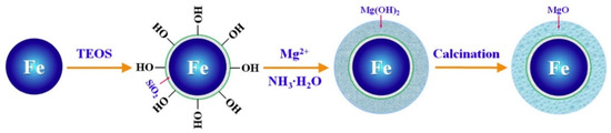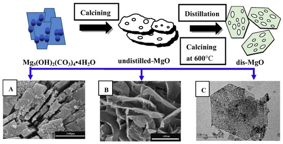 Magnesium oxide nanoparticles have many advantages as adsorbents for heavy metals, including an extraordinary adsorption capacity, low cost, nontoxicity, abundance, and environmentally friendly character [200]. Moreover, MgO nanoparticles are also equipped with an excellent antibacterial ability towards Gram-positive and Gram-negative bacteria as well as bacterial spores [201]. Research has indicated that Cd (II), Pb (II), and Escherichia coli could be removed from water simultaneously via MgO nanoparticles synthesized by the sol–gel method [200]. Mahdavi et al. investigated the different adsorption effects of nanosized TiO2, Al2O3, and MgO towards Cd (II), Cu (II), Ni (II), and Pb (II) from aqueous solutions [202]. The maximum uptake capacities of TiO2 nanoparticles towards Cd (II), Cu (II), Ni (II), and Pb (II) were 120.1, 50.2, 39.3, and 21.7 mg·g−1 respectively. The maximum uptake capacities of Al2O3 nanoparticles towards these four ions were 118.9, 47.9, 35.9, and 41.2 mg·g−1 while the adsorption capacities of MgO nanoparticles were 135, 149.1, 149.9, and 148.6 mg·g−1. The removal mechanism of MgO nanoparticles towards these four metals was attributed to adsorption and precipitation while the removal mechanisms of TiO2 and Al2O3 were mere adsorption. Tatenda C. et al. synthesized MgO nanoparticles via a combustion method and investigated their removal capability towards Cu (II) [203]. The results indicated that 96% of Cu (II) could be removed from a 10 ppm CuCl2 solution by using 0.2 g MgO nanoparticles, while the commercial MgO only exhibited a removal efficiency of 15%. Xiong et al. reported that the maximum adsorption capacities of MgO nanoparticles towards Cd (II) and Pb (II) were 2294 and 2614 mg·g−1 respectively, by calculating from the Langmuir equation in a batch adsorption experiment [204]. The adsorption process was influenced simultaneously by external mass transfer and intraparticle diffusion. The high adsorption capacities were attributed to the generation of OH− dissociated from Mg (OH)2, which was hydrated from MgO and the synergistic effects of precipitation and adsorption helped to achieve this adsorption capacities. In another batch adsorption study carried out by Feng et al., mesoporous MgO nanosheets were prepared (Scheme 3.) and they exhibited extraordinary removal capacity towards Ni (II) with the value of 1684.25 mg·g−1 calculated from the Langmuir model [205]. The pseudo-second-order model fitted the adsorption kinetic well. Distillation treating process could raise the SBET of MgO nanosheet up to 181.692 m2·g−1. Therefore, MgO nanoparticles have exhibited a promising application potential for removing heavy metals from wastewater.