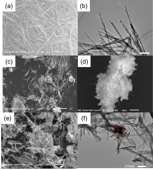 SEM of CdS NRs (a); CdS NRs-PANI (c) and CdS NRs-PANI-SiO2 hydrogel (d,e); TEM of CdS NRs (b) and CdS NRs-PANI-SiO2 hydrogel (f).