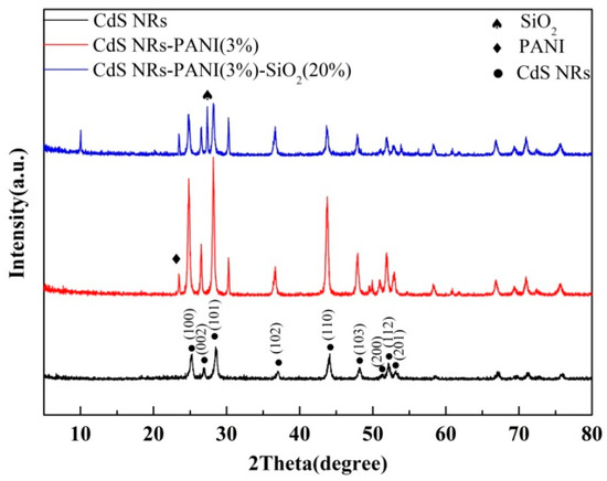 X-ray diffraction (XRD) spectra of CdS NRs, CdS NRs-PANI (3%), and CdS NRs-PANI (3%)-SiO2 (20%).