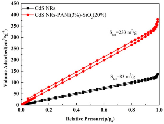In order to compare the specific surface area of composites with pure CdS NRs, the N2 adsorption–desorption isotherms were shown in Figure 3. The surface area of CdS NRs-PANI (3%)-SiO2 (20%) composites was much higher than that of CdS NRs, which would increase the active sites on the catalyst surface and promote hydrogen production during photocatalytic reaction.
