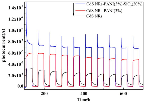 To explore the electron–hole separation efficiency, the transient photocurrent response spectra of the photocatalyst [30] were tested under visible light irradiation. It was obvious from the spectra (Figure 4) that the photocurrent response of composite CdS NRs-PANI (3%)-SiO2 (20%) was significantly stronger than that of CdS NRs and CdS NRs-PANI (3%) under the same measurement conditions. Its photocurrent was increased 1.67 times and 3.19 times, respectively, compared with CdS NRs-PANI (3%) and CdS NRs. It is well known that high photocurrent corresponds to good conduction of photogenerated carriers [31,32]. The introduction of PANI and SiO2 played a significant role in promoting charge separation and transmission efficiency, improving the electrochemical performance of CdS NRs, and thus enhancing the catalytic activity of CdS NRs. As a good electron acceptor material, PANI could effectively transmit the CdS NRs excited electron, leading to more effective charge separation and migration on the catalyst surface. The addition of SiO2 gel reduced the aggregation of CdS NRs and indirectly inhibited the photoetching of CdS NRs, thereby improving the photoelectric properties of the catalyst.