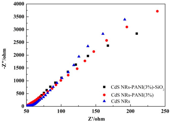 Electrochemical impedance spectra (EIS) plots of CdSNRs, CdS NRs-PANI (3%), and CdS NRs-PANI (3%)-SiO2 (20%).
