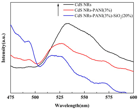 The recombination efficiency of photogenerated charge can also be analyzed by fluorescence spectroscopy [34,35]. Figure 6 shows the fluorescence spectra of CdS NRs, CdS NRs-PANI (3%), and CdS NRs-PANI (3%)-SiO2 (20%). There was a strong fluorescence peak [36] at 525 nm for CdS NRs monomers, caused mainly by electron–hole recombination. It can be seen that after the combination with PANI, the position of the peak did not change, but the intensity of the peak decreased gradually. After adding SiO2, the fluorescence peak became weaker. It indicated that the presence of PANI greatly inhibited the charge complexation and effectively improved the lifetime of photogenerated electrons and holes. The addition of SiO2 increased the specific surface area of the catalyst, which was also conducive to electron conduction. This result was consistent with the EIS and photocurrent experiments.