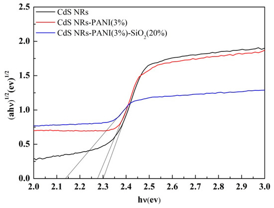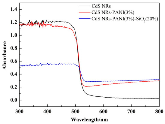 UV-visible diffuse reflectance spectra of CdS NRs, CdS NRs-PANI (3%), and CdS NRs-PANI (3%)-SiO2 (20%).