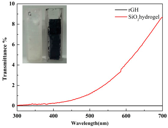 The use of SiO2 hydrogel as a supporting substrate to develop a photocatalyst with a 3D network structure has no shading effect for the resultant photocatalyst compared with other common materials such as reduced graphene oxide hydrogel (rGH) [37,38]. Figure 8 showed the transmittance test chart of rGH and SiO2 gel. It can be seen from the diagram that the transmittance of SiO2 gel under visible light was obviously higher than that of rGH, indicating that the use of SiO2 gel effectively avoided the shortcoming of easy shading.