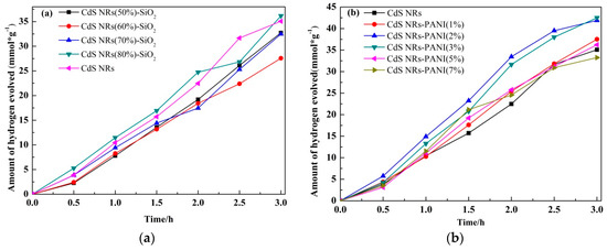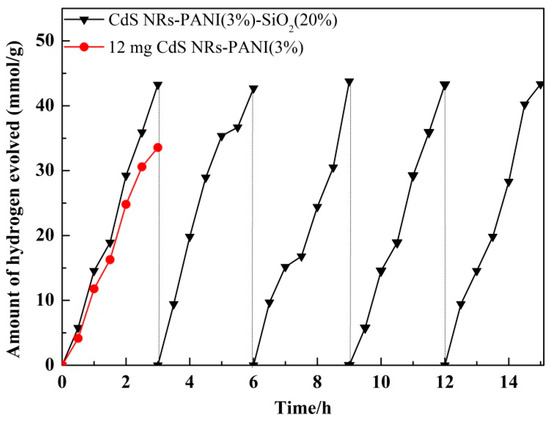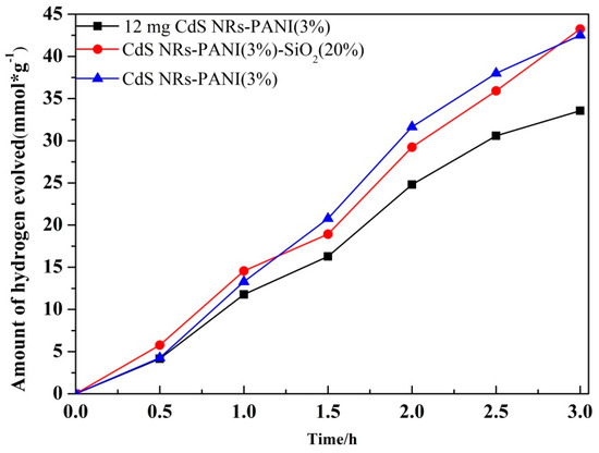 As shown in Figure 10, it was observed that the hydrogen production amount of the ternary composite CdS NRs-PANI (3%)-SiO2 (20%) was as high as 43.25 mmol/g. Compared with the equivalent CdS in CdS NRs-PANI (3%), the photocatalytic activity of hydrogen production increased obviously. It may be due to SiO2 gel to increase the specific surface area of the catalyst and the active sites of the catalyst surface. Compared with the same amount of CdS NRs-PANI (3%) as the catalyst, the hydrogen evolution activity of the catalyst was improved slightly. This was due to the fact that with the increase of SiO2 content, the content of CdS NRs decreased, meaning the photocatalytic hydrogen production activity was not significantly improved.