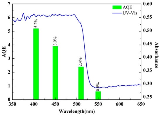 Figure 11 shows the activity diagram of photocatalytic hydrogen production under different visible light wavelengths (405, 450, 510, and 550 nm). The AQE of the catalyst reached 5.2% at 405 nm and, with the increase of the wavelength, the AQE decreased. Under the condition of 550 nm, the AQY of the composite catalyst decreased to 0.6%. This result was consistent with the optical properties obtained by experiments. The optical absorption characteristics of the catalyst had a significant effect on the activity of the catalyst.
