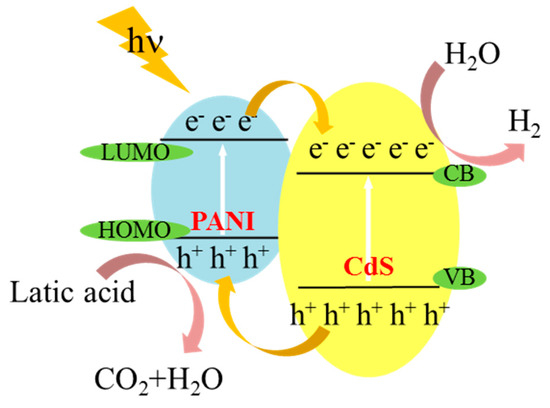 According to the above results, the photocatalytic mechanism was speculated as shown in Figure 14. Under visible light irradiation, electrons on both CdS NRs and PANI could be excited. From the energy band position, CdS NRs had a more positive energy level position than PANI, so electrons on the PANI monomer LUMO were easier to transfer to CdS NRs. On the other hand, the holes in the VB orbits of CdS NRs were easier to transfer to the HOMO orbits of PANI, and the photogenerated electrons would be rapidly transported to the surface of CdS NRs to realize the effective separation of e− and h+. Electrons on the surface of CdS NRs were reduced to form hydrogen. The matching of energy levels made it easier for CdS NRs-PANI composites to achieve effective separation of photogenerated e−/h+ pairs and improved the lifetime of photogenerated charges. The three-dimensional structure of SiO2 gel reduced the aggregation of CdS NRs, which improved the specific surface area of the catalyst and increased the active sites on the catalyst surface, resulting in effective photocatalytic performance.