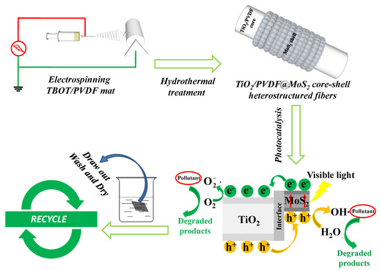 Therefore, the key for preparation of a highly active and recyclable TiO2-based photocatalyst is to find a strategy for inhibiting photo-generated electron-hole recombination, narrowing the band gap and easy recovery and recycle. To this end, many strategies have been developed, one of which is the composition of narrow band gap semiconductors to TiO2 to form a heterogeneous structure [4,5,6]. On the one hand, the composition of narrow band gap semiconductors can improve the photocatalytic activity of TiO2-based photocatalysts by expanding their light capture window to the visible range [7]. On the other hand, the heterostructure between narrow band gap semiconductors and TiO2 can also enhance the charge separation by coupling two semiconductor structures with matched energy levels, thereby increasing the photocatalytic activity and efficiency of the TiO2-based photocatalyst [8,9]. Among many narrow bandgap semiconductors, molybdenum disulfide (MoS2) has become the material of choice for composite heterostructures due to its large reserves, low cost, and excellent electronic and optical properties [10,11,12]. Zheng et al. synthesized hierarchical MoS2 nanosheet@TiO2 nanotube arrays by combining the anodic oxidation method and hydrothermal method [13]. The as-prepared hierarchical composite materials are of enhanced photocatalytic and photocurrent performances. Liu et al. prepared 3D sandwich-like heterojunction structured mesoporous black TiO2/MoS2/TiO2 nanosheets which have 89.86% methyl orange degradation rate and 0.56 mmol·h−1·g−1 hydrogen production rate [14]. However, the above-mentioned several kinds of composite photocatalysts still exist in the form of powder. Therefore, there is still a disadvantage for recovery and recycle when the photocatalyst was used in a reaction solution. In order to improve the recovery and recycle of a photocatalyst, the method of supporting the photocatalytic material on an inorganic porous material or a polymer material has been reported [15,16,17,18]. Zhang et al. fabricated 3D MoS2 nanosheet/TiO2 nanofiber heterostructures by using the electrospinning method combined with hydrothermal treatment [19]. The as-synthesized fibers presented enhanced performance in the photocatalytic decomposition of organic dyes under UV light irradiation. However, a high temperature post-sintering process was employed in the synthesis procedure to remove the polymer composition, which resulted in the as-synthesized nanofibers being too fragile and difficult to reuse [20]. In order to solve the problem of difficult to recover photocatalysts, flexible substrate materials have been introduced as photocatalyst carriers [21,22,23,24]. Lin et al. synthesized a novel floating sheet used in solar photocatalytic water splitting. The as-synthesized novel floating sheet consists of WSe2 film laser-deposited on a carbon foam substrate and nanodiamond-embedded Cu2O photocatalysts, which has better reusability [21]. Yu et al. synthesized AgX (X = Br, I)-TiO2 nanoparticles immobilized on polyacrylonitrile (PAN) nanofibers by combining the electrospinning technique, solvothermal synthesis, physical adsorption, and gas/solid reaction. The as-prepared composite showed excellent visible light catalytic performance against various pollutants [24]. Polyvinylidene difluoride (PVDF), a widely used commercial polymer material, which has the advantages of good thermal stability, high mechanical strength, and chemical resistance, is very suitable as a carrier for flexible composite materials [25]. Our previous work showed that the use of PVDF as photocatalyst carrier can be a good solution for the separation and recovery of photocatalysts from the reaction solution [26].