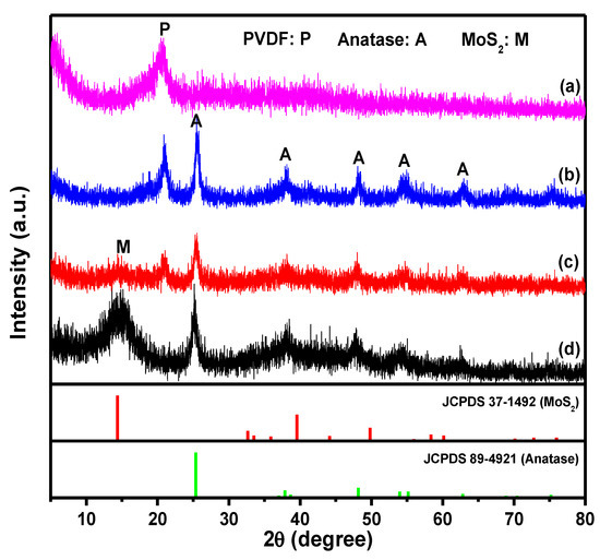 Figure 2 depicts the X-ray diffraction (XRD) patterns of the as-prepared samples. As displayed in Figure 2 curve (a), no obvious diffraction peak was detected except the diffraction peak 2θ at 20.7° which can be assigned to the β phase of PVDF [27,28]. This means that the TiO2 small crystal in the TBOT/PVDF hybrid fibers mat, formed through TBOT hydrolyzed with the H2O in air, was mainly in the amorphous structure. After hydrothermal reaction in 0.5 M H2SO4 at 150 °C for 24 h, the characteristic diffraction peaks of anatase phase TiO2 (PDF card 89-4921, Joint Committee on Powder Diffraction Standards (JCPDS)) appeared in the prepared hybrid material, whose diffraction peaks 2θ at 25.6, 37.9, 48.2, 54.4, and 62.8° as shown in the curve (b). The addition of H2SO4 ensured the formation of anatase phase TiO2 [29]. In addition to the above-mentioned anatase phase TiO2 diffraction peaks in the curve (b), a weak and broad diffraction peak at 14.4° can be detected in the curve (c), which can be indexed to the (002) crystal face of MoS2 (PDF card 37-1492, JCPDS). Comparing curve (c) with curve (a) and (b), it can be seen that the intensity of the diffraction peaks of PVDF and anatase TiO2 decreased after synthesizing MoS2 on TiO2/PVDF fibers, indicating that the surface area of TiO2/PVDF was covered with MoS2 that forms a core-shell structure. In order to further determine whether the preparation of MoS2 was successful, the powder in the hydrothermal autoclave was centrifuged after hydrothermal reaction and tested (shown in curve (d)). Comparing curves (d) with (c), it was obvious that all the diffraction peaks were at the same position except the diffraction peaks of PVDF especially, where the diffraction peak of MoS2 became stronger, indicating the MoS2 was synthesized successfully. As a comparison, the XRD patterns of pure PVDF fibers mat, MoS2/PVDF hybrid fibers mat and MoS2 powder remaining in the hydrothermal autoclave after hydrothermal synthesizing MoS2/PVDF hybrid fibers mat were displayed in Figure S2 (SI). It can be concluded the MoS2 was successfully grown on the PVDF fibers.