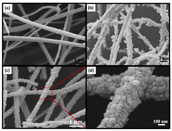 SEM images of (a) TBOT/PVDF fibers, (b) TiO2/PVDF fibers, (c) TiO2/PVDF@MoS2 fibers, and (d) high resolution SEM image of TiO2/PVDF@MoS2 core-shell heterostructured fibers.