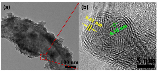 The morphology of TiO2/PVDF@MoS2 core-shell heterostructured fiber was further confirmed by TEM and HRTEM, as shown in Figure 4. It is clearly observed that the very fine MoS2 particle grew on the surface of TiO2/PVDF fiber and core–shell structures appeared, as displayed in Figure 4a. The high-resolution TEM image showed that the MoS2 particles with several layer thicknesses were about 5 nm in size. In addition, the MoS2 particles with an average spacing of 0.61 nm can be seen, which belongs to the (002) facet of MoS2 [30,31,32]. In Figure 4b, the lattice spacing of TiO2 was measured to be 0.35 nm, which was in close agreement with (101) facets of anatase TiO2 [33]. The lattice spacing shown in the HRTEM images is consistent with the XRD results, further confirming the formation of TiO2/PVDF@MoS2 core-shell structure.
