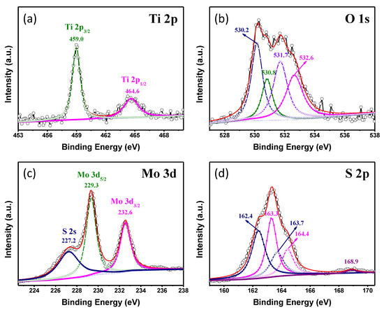 The chemical composition information and the bonding configuration of the as-prepared products were determined by XPS analysis. Characteristic peaks from Mo, S, O, Ti, F, and C can be clearly found from the XPS survey spectra, as shown in Figure S4 (SI). Figure 5 illustrates the high-resolution XPS spectra of Ti 2p, O 1s, Mo 3d, and S 2p. As shown in Figure 5a, the binding energies of Ti 2p3/2 and Ti 2p1/2 peaks were located at 459.0 and 464.6 eV, respectively [34]. The peak of O1s was broken up into four peaks (shown in Figure 5b), respectively, corresponding to Ti-O of TiO2 (530.2 eV), Ti-O-Mo bonds between MoS2 and TiO2 (530.8 eV), hydroxyl group (531.7 eV), and C-O bond (532.6 eV) in the resultant product [35,36,37]. In Mo 3d profiles (Figure 5c), the peaks at 232.6 and 229.3 eV were corresponding to 3d3/2 and 3d5/2 of Mo4+, respectively. And the satellite-peak at 227.2 eV ascribed to 2s of S species [38]. Meanwhile, the peaks of S element could be divided into three different chemical environments, as displayed in Figure 5d. The broad spectra could be fitted with sets of doublets related to spin orbit split to 2p3/2 and 2p1/2. The peaks at binding energies of 162.4 and 163.7 eV were assigned to the 2p3/2 and 2p1/2 of S2− [13]. Whereas, the peaks at 163.3 and 164.4 eV may be assigned to C-S bonds or related to the presence of bridging S22− [39,40]. Besides, the weak peak at 168.9 eV was related to the residual of SO42− in the as-prepared sample [41,42]. These results further confirmed the presence of MoS2, TiO2, and PVDF, which agreed well with the XRD and TEM results.