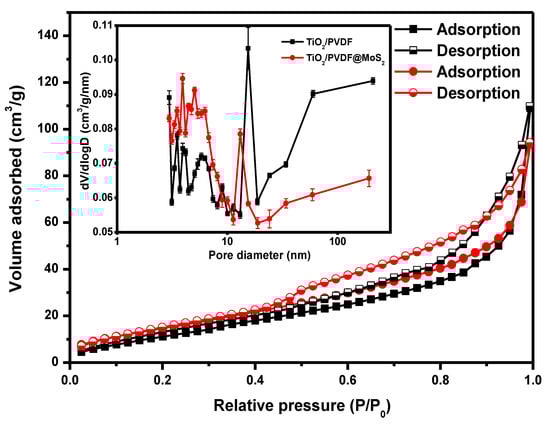 To investigate the specific surface area of resultant products, nitrogen adsorption-desorption analysis was carried out by using the BET method. Figure 6 displays the nitrogen adsorption–desorption isotherms of TiO2/PVDF and TiO2/PVDF@MoS2 fibers, and the inset illustrates the corresponding pore diameter distribution by using the Barrett-Joyner-Halenda (BJH) method. The isotherm curves of TiO2/PVDF and TiO2/PVDF@MoS2 fibers were well in agreement with the type IV isotherm behavior with H3 hysteresis [43,44].