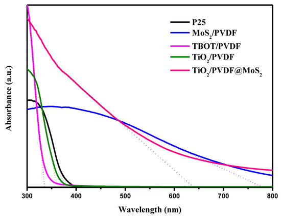 Optical absorption of P25, PVDF, MoS2/PVDF, TBOT/PVDF, TiO2/PVDF, and TiO2/PVDF@MoS2 were investigated by UV-Vis diffuse reflectance spectra, displayed in Figure 7. It can be found that all materials had a strong absorption except PVDF at wavelengths below 400 nm. Most especially, the TBOT/PVDF fibers had the strongest absorption in the ultraviolet region, owing to formation of amorphous structured TiO2 crystal through TBOT hydrolyzed with the H2O in air. In the visible light region, the samples with MoS2 particles covered on the surface present enhanced absorption character compared to P25 and TiO2/PVDF fibers.