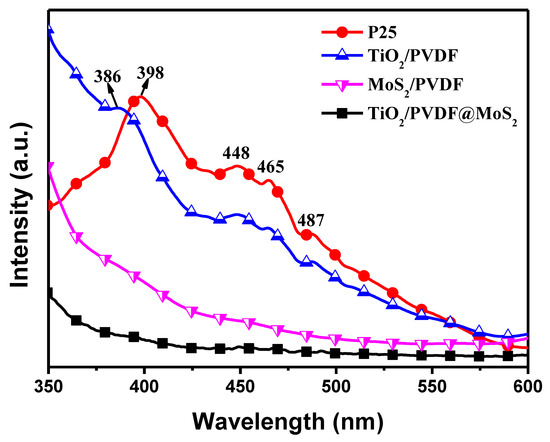 The photoluminescence (PL) spectra were usually used to evaluate the efficiency of charge trapping and recombination of photo-induced electron-hole pairs in the semiconductor [47,48]. Figure 8 shows the PL spectra of P25, TiO2/PVDF, MoS2/PVDF, and TiO2/PVDF@MoS2. There were four main emission peaks for P25 and TiO2/PVDF, respectively. The peak located at 398 nm (≈3.12 eV) belonged to P25; meanwhile, the peaks located at 386 nm (≈3.21 eV) belonged to TiO2/PVDF. The other three peaks, located at 448 nm (≈2.77 eV), 465 nm (2.67 eV) and 487 nm (≈2.55 eV), respectively, appear in both P25 and TiO2/PVDF. The first peak of these two materials corresponded to their near-band gap emission [26], whereas the other three peaks were likely assigned to the emission of oxygen vacancies related defect formed in the synthetic process [49,50,51]. Besides, it is obviously that P25 has the highest PL intensity, which means having the highest photo-generated electron-hole recombination. Interestingly, the PL intensity of TiO2/PVDF fibers was weaker than that of P25, implying a relatively higher photo-generated electron-hole separation efficiency. The formation of F-Ti coordination bond in the fibers and the relatively high ionic conductivity of PVDF as a ferroelectric material should take the main responsibility [22]. In addition, the TiO2/PVDF@MoS2 fiber has lower PL intensity compared to the MoS2/PVDF fiber, which was attributed to the core-shell heterostructure, indicating that the recombination of photo-generated electron-holes was suppressed effectively. Therefore, the TiO2/PVDF@MoS2 could effectively enhance the separation of photo-generated charge carriers and extend the lifetime of photo-generated electron-hole pairs, leading to the superior photocatalytic activity.