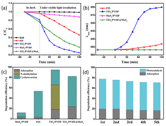 (a) Photocatalytic degradation curves of RhB over the samples: RhB without photocatalyst, P25, TiO2/PVDF, MoS2/PVDF and TiO2/PVDF@MoS2. (b) The wavelength of maximum absorption λmax vs irradiation time. (c) The adsorption of RhB in dark as well as the N-deethylation and cycloreversion of RhB under visible light irradiation for different samples. (d) The degradation performance during 45-min adsorption of RhB in dark and 120-min photocatalytic degradation of RhB with the TiO2/PVDF@MoS2 core-shell heterostructured fibers. The experiment was repeated five times.