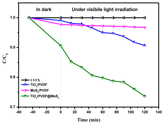 Photocatalytic degradation curves of LVFX over the samples: LVFX without photocatalyst, TiO2/PVDF, MoS2/PVDF and TiO2/PVDF@MoS2.