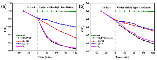 Control experiments with radical scavengers. (a) The relative concentration variation plots of RhB solution using TiO2/PVDF fibers as the photocatalyst. (b) The relative concentration variation plots of RhB solution using TiO2/PVDF@MoS2 fibers as the photocatalyst.