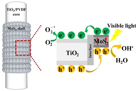 Schematic illustration for the photo-generated electron-hole separation and transfer process between TiO2/PVDF core and MoS2 shell.