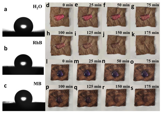 The optical images taken while the water and dye droplets come into contact to the surface of TiO2/PVDF@MoS2 core-shell heterostructured fibers (a–c). Photographs of the RhB (d–k) and MB (l–s) droplet on the surface of TiO2/PVDF@MoS2 core-shell heterostructured fibers under visible light illumination.