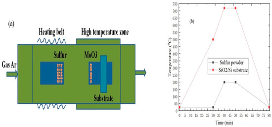 (a) Growth experiment schematic diagram of MoS2; (b) temperature change diagram of MoS2 grown by atmospheric pressure chemical vapor deposition (APCVD).