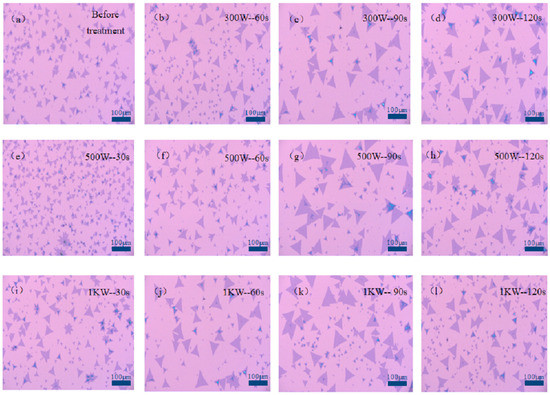 The growth of MoS2 on SiO2/Si substrate under the different oxygen plasma treatment time and power. (a) Before treatment, (b) 300 W, 60 s, (c) 300 W, 90 s, (d) 300 W, 120 s, (e) 500 W, 30 s, (f) 500 W, 60 s, (g) 500 W, 90 s, (h) 500 W, 120 s, (i) 1 KW, 30 s, (j) 1 KW, 60 s, (k) 1 KW, 90 s, (l) 1 KW, 120 s.