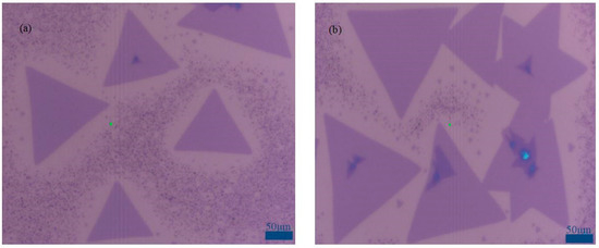 Growth of different regions MoS2 on SiO2/Si substrate under optimal treatment condition (a) first region; (b) second region Scale bar: 50 μm.