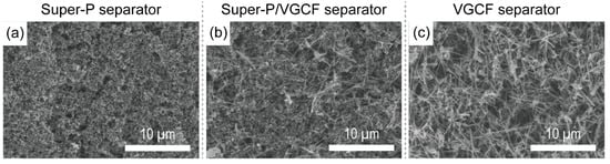 For simplicity, the carbon-coated separator containing pure Super-P, the Super-P/VGCF combination, and pure VGCF are denoted as the Super-P, Super-P/VGCF, and VGCF separators, respectively.