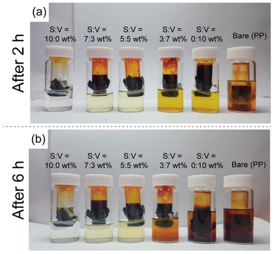 Figure 2. Digital camera images of polysulfide diffusion experiments after (a) 2 h and (b) 6 h. The inner glass tube filled with a mixture of polysulfide (Li2S6) and control electrolyte (DME/DOL, 1:1 by vol.) was wrapped with various types of separators, while the outer glass tube was filled with control electrolyte. S:V indicates the weight ratio of Super-P to VGCF.