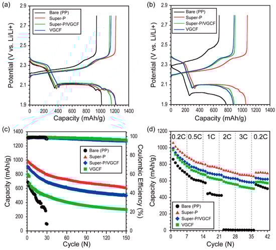 As shown in Figure 3c, the cycle performance of the Li–S batteries containing the carbon-coated separators was evaluated at a discharging rate of 1 C. The unit cells containing larger amounts of Super-P showed a higher initial discharge capacity (after the first cycle, Super-P = 984.3 mA∙h∙g−1, Super-P/VGCF = 903.0 mA∙h∙g−1, VGCF = 795.9 mA∙h∙g−1, bare PP = 690.4 mA∙h∙g−1). The cycle performance of Li–S batteries was greatly improved when larger amounts of Super-P were used (after 150 cycles, Super-P = 602.1 mA∙h∙g−1, Super-P/VGCF = 501.5 mA∙h∙g−1, VGCF = 301.0 mA∙h∙g−1, bare PP = 0 mA∙h∙g−1). Because the Gurley number is defined by passing a specific amount of air through the medium, the exact correlation between the polysulfide and the separators cannot be clearly explained. Nonetheless, it is plausible that separators with a high Gurley number are beneficial in inhibiting polysulfide migration since the Gurley number reflects the tortuosity of the separators [32,37]. With this in mind, the improved cycle performance of the Li–S unit cells containing Super-P separators is reasonable.