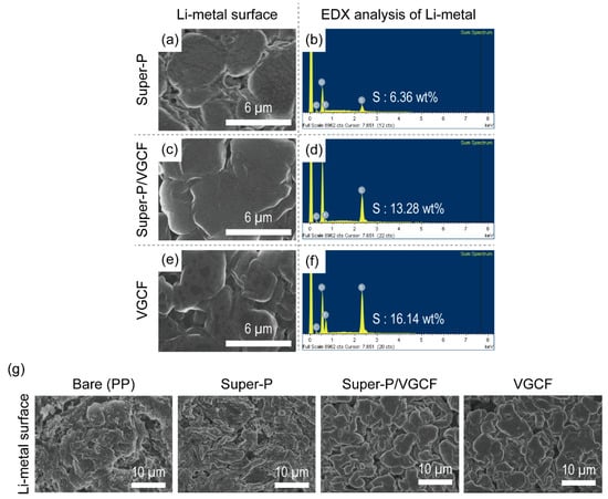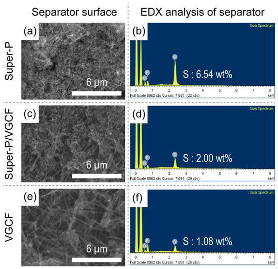 The surface structure of the cathode side of each separator was also observed using SEM and EDX. As shown in Figure 5, the morphological structures of the separators are almost similar to those shown in Figure 1. In contrast, the elemental composition determined by EDX showed that the Super-P-rich separator contained larger amounts of the element sulfur (Super-P = 6.54 wt.%, Super-P/VGCF = 2.00 wt.%, and VGCF = 1.08 wt.%). On the other hand, as shown in Figure 6, after exposure to the same experimental conditions, the Li metal surface was observed using SEM and EDX. Again, although the morphological structure was almost the same, the Li metal recovered from the disassembled Li–S unit cells containing Super-P-rich separators contained a smaller amount of the element sulfur on the surface (Super-P = 6.36 wt.%, Super-P/VGCF = 13.28 wt.% and VGCF = 16.14 wt.%). The sulfur element was originated from the sulfur-containing species, namely polysulfide and LiTFSI. The relationship between polysulfide and LiTFSI for electrochemical decomposition during discharge has not yet been clearly understood. Nonetheless, it can be easily deduced that the elemental change of the Li metal surface depends mainly on the amount of polysulfide. This is because the amount of LiTFSI is the same in all cases because the same amount of liquid electrolyte is used, but the amount of polysulfide changes during operation.