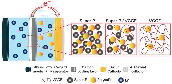 Sulfur (100 mesh, Sigma–Aldrich, St. Louis, MO, USA), Ketjenblack (Ketjenblack®EC-600JD, AkzoNobel, Amsterdam, Netherlands), poly(vinylidene fluoride) (PVdF, KF-1300, Kureha, Iwaki, Japan, Mw = 350000), vapor-grown carbon fibers (VGCFs, Showa Denko K.K, Tokyo, Japan), Super-P (Li-conductive) (IMERYS, Paris, France), poly(vinylidene fluoride-co-hexafluoropropylene) (PVdF-HFP, Kynar Flex® 2801, Arkema Inc., Colombes, France), N-methyl-2-pyrrolidone (NMP, Sigma–Aldrich), 1,3-dioxolane (DOL, Sigma–Aldrich, St. Louis, MO, USA), 1,2-dimethoxyethane (DME, Sigma–Aldrich, St. Louis, MO, USA), LiTFSI (Enchem, Jecheon, Korea), Li metal foil (thickness = 200 µm, Honjo Metal Co., Osaka, Japan), and polypropylene (PP) separators (thickness = 25 μm, Celgard 2400, Celgard®, Charlotte, NC, USA) were used as separators.