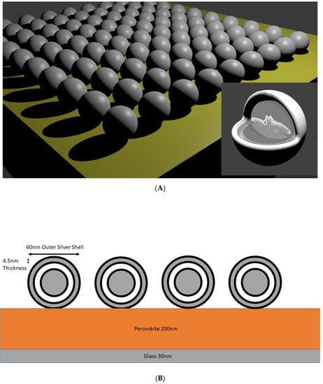 (A) An artistic depiction of one configuration with core-shells nanoparticles on top of a Perovskite thin film. The inset shows the different core and shells (glass and silver). (B) Detailed schematic illustration of the best performing core-shells setup.