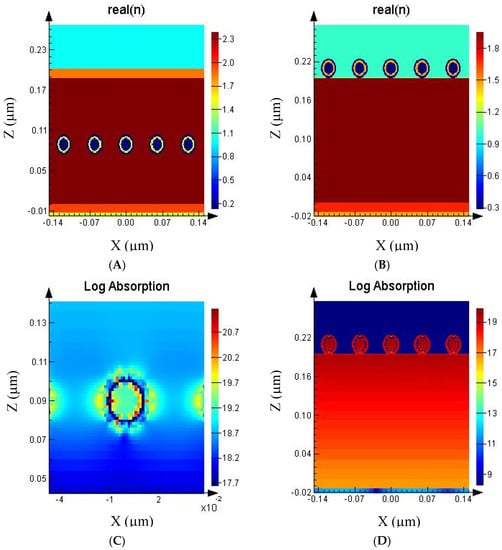 Refractive index (n) of the silver core-shells particle (30 nm) array (A) inside Perovskite and (B) on top of the Perovskite thin film. The right color bar indicates the real n value. The red corresponds to Perovskite, blue with silver and yellow with glass. (C) The log of the optical absorption through the x-z plane (parallel to light direction) of a single core-shells particle inside Perovskite and (D) through the x-z plane (perpendicular to light direction). The origin of the monitor boxes was placed at the bottom of the Perovskite layer which results in negative position values for the glass layer. The intensity scale bar units are log absorption (ratio incident power and absorbed power) m-3. The cross sections are recorded at 555 nm for the particles inside Perovskite and 336 nm for the nanoparticle on top of the Perovskite thin film, which corresponds to the first silver plasmon resonance peak.