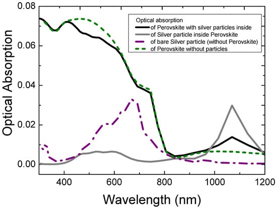 The optical absorption spectra in Perovskite with and without silver core-shells particles are shown in Figure 3 along with a silver core-shells particle with and without Perovskite. The optical absorption of bare silver particles has an initial peak at around 550 nm, which is the red-shifted silver particle plasmon peak, due to the surrounding Perovskite with a high refractive index. The surrounding Perovskite optical absorption is slightly reduced around this wavelength as compared with the Perovskite without nanoparticles, due to the antenna properties of the silver core-shells nanoparticle [3,48], which directs radiation to the particle and converts it into heat by collective electron motion. At around 1100 nm the optical absorption in Perovskite and the silver particle have increased substantially as compared with their bare counterparts. The increased absorption in silver indicates a second silver particle plasmon resonance, due to the coupling between the metallic core and metallic shell, which is considerably red-shifted due to the extended length [49]. Because the optical absorption in Perovskite at this wavelength is much smaller compared to around 555 nm (the first plasmon resonance peak), the plasmon response is able to produce a net optical absorption gain. For each different silver core-shells particle configuration, a trade-off between optical absorption in Perovskite and silver at different wavelengths produces a net optical absorption gain or loss.