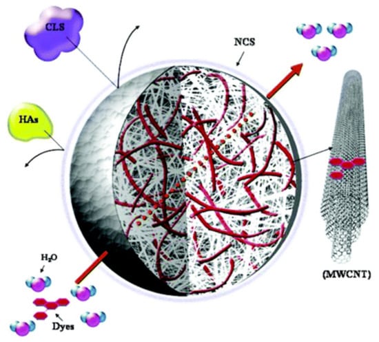 Schematic representation of the advantageous performances of the caged MWCNTs on dye adsorption. Reprinted with permission from [25]. Copyright (2008) American Chemical Society.