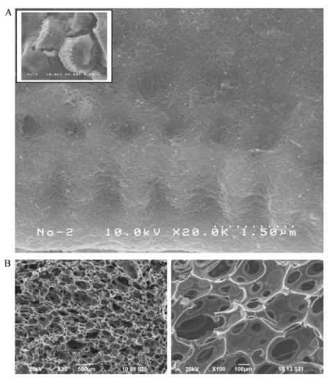(A) Prussian blue was sealed into the cavities of the diatomite (upper, lower resolution). The diatomite surfaces were coated with highly dispersed multi-walled CNTs (upper, high resolution). The CNTs formed a continuous, interconnected network that prevented the diffusion of Prussian blue particles. (B) Representative SEM images of the quaternary (polyurethane polymer, CNTs, diatomite, and Prussian blue, PUP/CNT/DM/PB), spongiform, Prussian blue based adsorbent. Reproduced with permission from [57]. Copyright Elsevier, 2012.