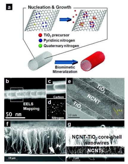 Until now, a hybrid of TiO2 and graphitic carbon (CNT, graphene, etc.) has gained tremendous research interest [84,85]. Ideal TiO2/graphitic carbon hybrids reinforced with electroconductive and mechanically strong carbon nanotubes or a graphene backbone may possess an extremely large TiO2/carbon interface that can facilitate electron-hole separation. Moreover, such interfacial hot spots may introduce a new carbon energy level in the TiO2 band gap and thereby effectively lower the band gap energy [78,86]. Lee et al. have reported the N-doped CNT (NCNT)/TiO2 core/shell nanowires for visible light-induced MB degradation by biomimetic mineralization of TiO2 at the graphitic carbon surface [78]. They proposed that N-doped sites on the NCNT attracted Ti precursors and it promoted their condensation to form a highly uniformTiO2 nanoshell with excellent coverage (Figure 4). Regarding to the NCNT/TiO2 core/shell nanowires, the biomimetic mineralization yielded highly uniform coverage of a ~5 nm thick TiO2 nanoshell over the entire length of the vertical CNTs because of the dense evenly distributed N-doping sites. The electroconductive and thermally stable NCNT backbone enabled high temperature treatment that optimized the corresponding crystal structure and properties of TiO2 nanoshell. The direct contact of the NCNT surface and TiO2 nanoshell without any adhesive interlayer introduced a new carbon energy level in the TiO2 band gap, leading to the great visible light photocatalysis in MB degradation. Furthermore, the synergistic properties of core/shell nanowires also greatly enhanced the stimuli-responsive wettability. So this ideal multi-functional TiO2/graphite-carbon hybrid nanostructure could facilitate a variety of artificial applications, including sensors, catalysts, energy storage and conversion.