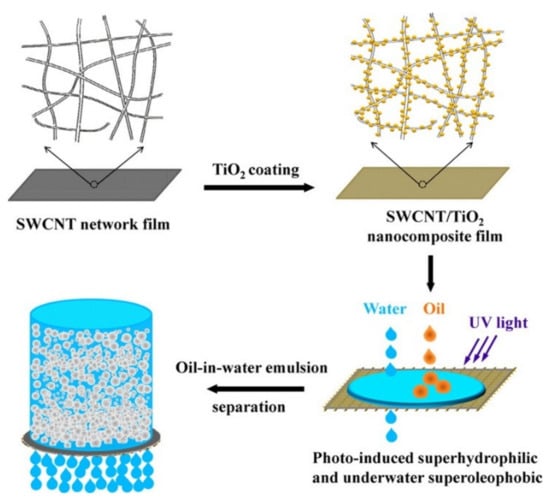 Schematic showing the preparation process of the SWCNT/TiO2 nanocomposite film and for separation of an oil-in-water emulsion. Reprinted with permission from [75]. Copyright (2014) American Chemical Society.