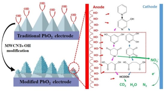 - Xu, Z.; Liu, H.; Niu, J.; Zhou, Y.; Wang, C.; Wang, Y. Hydroxyl multi-walled carbon nanotube-modified nanocrystalline PbO2 anode for removal of pyridine from wastewater. J. Hazard. Mater. 2017, 327, 144–152. [Google Scholar] [CrossRef]