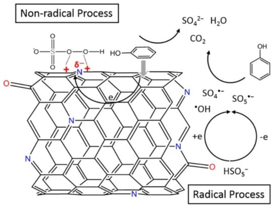 Recently, a novel oxidation technology based on nonradical activation mechanism of peroxydisulfate (PDS) by carbon nanotubes has received increasing attention, showing high reactivity towards phenol, bisphenol A, et al. [92,93]. Unlike the case for other advanced oxidation processes in which free radicals are the keys for organic degradation, nonradical processes were also observed on the modified CNT samples upon nitrogen doping. Duan et al. prepared N doped carbon nanotubes (NoCNTs) as metal free catalyst by the chemical modification of SWCNTs with substitutional N incorporation into the rolled graphene sheets for phenol catalytic oxidation [83]. A comprehensive research for the mechanism of peroxymonosulfate (PMS) activation and the roles of nitrogen heteroatoms has been studied. Nitrogen heteroatoms in CNT played a significant role in phenol oxidation with PMS, which might greatly enhance both the radical and nonradical pathways that are beneficial to the phenol degradation. And the nonradical pathway accompanied by radical generation (•OH and SO4•−) enable the NoCNT to have great stability (Figure 7). NoCNT presented an extraordinarily high catalytic activity for phenol removal by PMS activation with a 57.4-fold enhancement over the activity of NoCNT. Thus, this study provided insight to the role of N doped carbon nanotubes for enhanced catalysis and the designing of metal free catalyst with high catalysis performance and stability. Besides, functional carbon nanotubes have been used as carriers towards the improvement of various catalytic activity [94,95].
