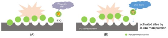 Success of a typical adsorption relies on adsorbent providing active sites (imbalanced or residue force at their surfaces) and adsorbate capable of fast migration (Figure 8A). Thus, for activated carbon, the preparation has to go through an extra chemical/physical activation processing besides the carbonization of raw material to generate functioning sites for high performance adsorption. In contrast to bulky status of activated carbon, obtained graphene/GO as above mentioned is in nature of nano sizes, intrinsically with large surface area. Besides, the GO surface-grafted functionalities to large extent help unfold the sheets exposing to foreign contaminants as well as to resist GO aggregation into flocculates in water, which may have great impact on the utilization performance.